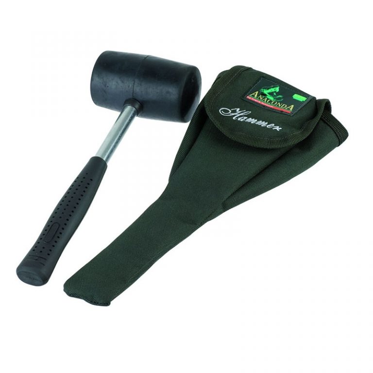 Een rubberhamer, Die uitermate geschikt is om de haringen in de grond te slaan., Zonder deze hammer zouden de haringen beschadigen. Hij wordt geleverd in een mooie waterafstotende hoes.