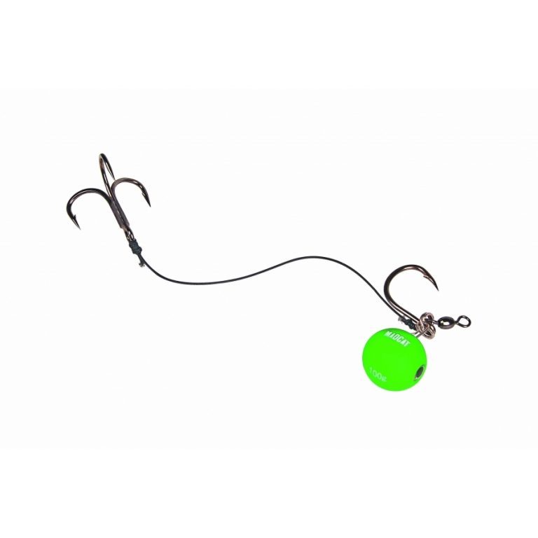 Madcat Snap-On Vertiball Rig: Catfish vertical jig systems with a clip-on lead ball. All parts (swivel, splitring, solid ring, single hook and treble) are heavy duty. Ready to use. Loose MADCAT® snap-on vertiballs are available in various sizes, so you can adjust the weight quickly. Which rig and/or weight you should choose depends on the current, depth of the water and the size of the baitfish.