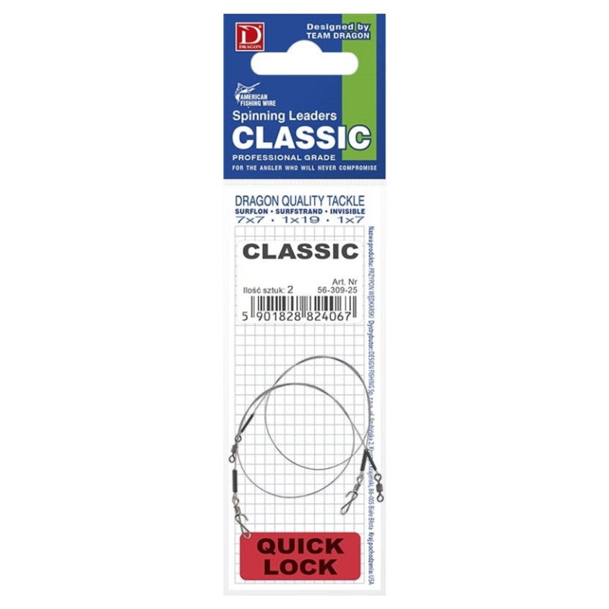 Gemaakt van top kwaliteit staaldraad American Fishing wire Surfstrand. De Dragon AFW 1x7 Spinning leaders zijn soepel en extra dun. Door gebruik te maken van de Dragon Quicklock speld is het kunstaas razend snel te wisselen ook met koude handen. Door de wijde speld heeft het kunstaas maximalle bewegings vrijheid voor optimale bewegings actie. De onderlijnen worden met de hand gemaakt. Zo worden de sleeves met een sleevetang via luchtdruk met de juiste kracht vast geknepen.