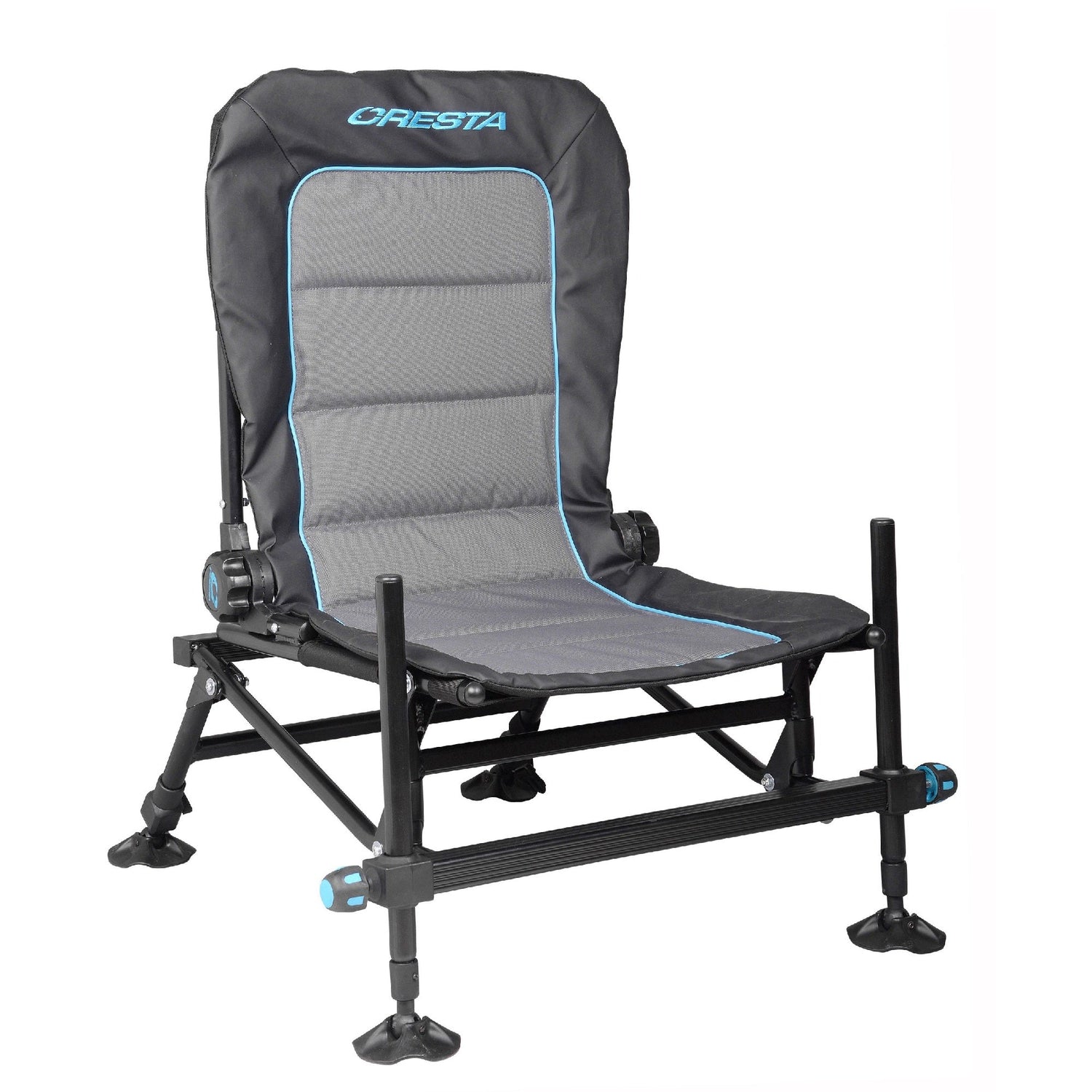 De Cresta Blackthorne Compact Chair 2.0, naast de bekende Comfort Chair High, biedt nu een lage versie van de stoel met een uniek inklapbaar dubbel frame systeem. Dit ontwerp maakt de stoel ideaal voor kleinere personen en voor gebruik op schuin aflopende oevers. Door het frame aan de achterkant te verlagen en de poten in te korten, komt de stoel dichter bij de grond. Ondanks de lagere positie blijft de stabiliteit hoog, dankzij het frame dat aan de voorzijde hoger blijft wanneer het is uitgeklapt. Dit zorgt ook voor voldoende ruimte om steunen op de individueel instelbare voorpoten te plaatsen.
