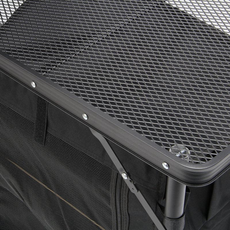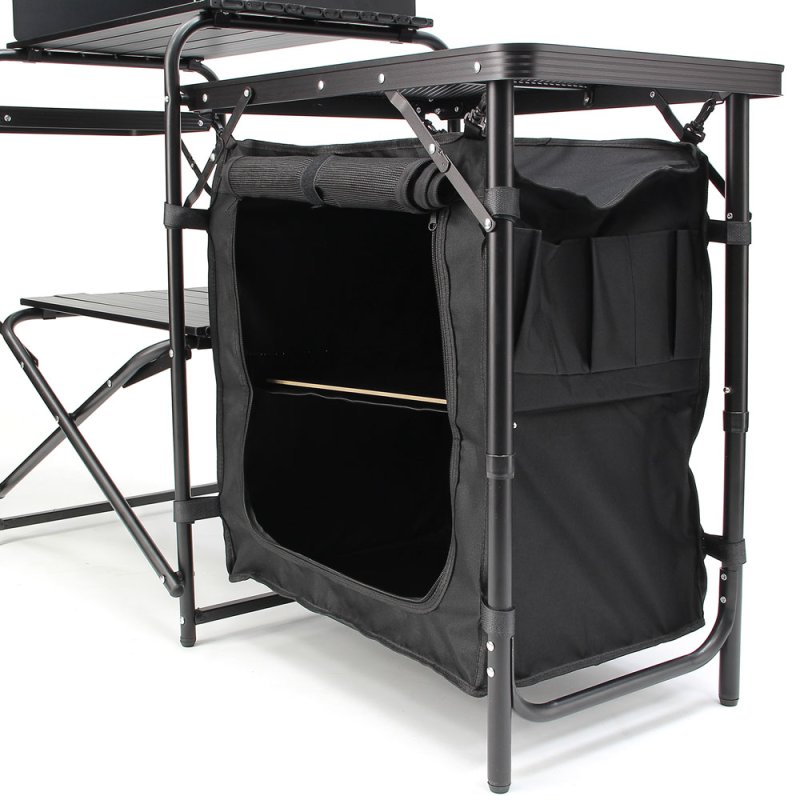 De station kan binnen enkele seconden worden opgeklapt en biedt meerdere werk- en opbergvlakken voor het bereiden van eten, het plaatsen van een kooktoestel en het opbergen van kookgerei of andere accessoires.