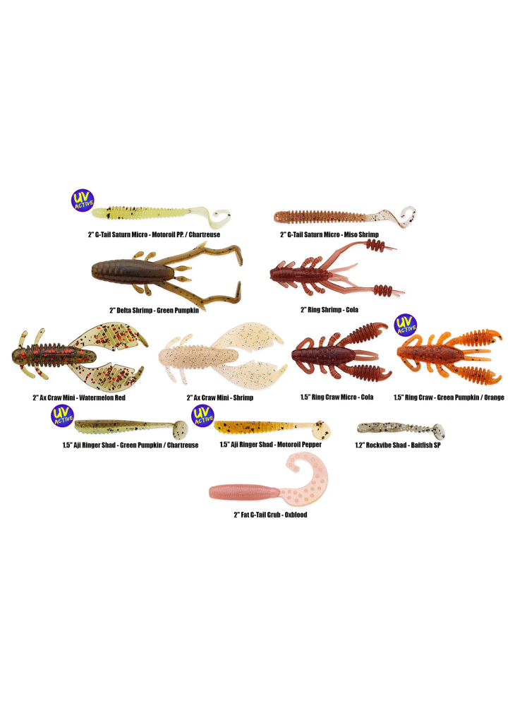 De set bevat een gevarieerde mix van shads, craws en shrimp-modellen in natuurlijke en felle kleuren, waarmee je in elke situatie een passende presentatie hebt. Dankzij het zachte, levensechte materiaal bewegen de kunstaasjes overtuigend – of je ze nu vist aan een lichte jigkop, drop shot, carolina rig of Texas rig.